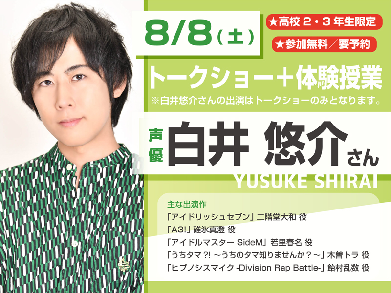 今回は「アイドリッシュセブン」二階堂大和役、「A3!」碓氷真澄役などで有名な声優 白井悠介さんが来校!業界についてのトークショーを行います!