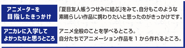 今回は「株式会社A-1 Pictures」に進路が決定したアニメーターコースの黒岩さんに、今の心境や就職活動のことについてインタビューに答えてもらいました♪