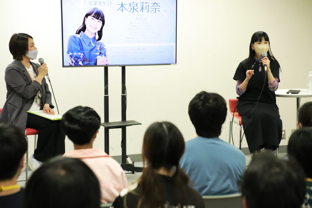 4/30(日)オープンキャンパスにて、「異世界召喚は二度目です」ミネコ 役、ゲーム「プロジェクトセカイ カラフルステージ! feat.初音ミク」日野森雫 役など、幅広く活躍していらっしゃる卒業生声優 本泉莉奈さんをお招きしてトークショーが開催されました。