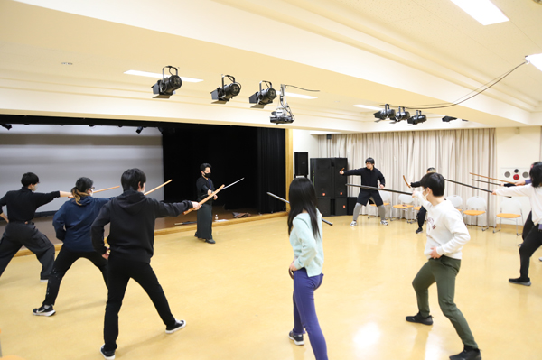 実際に舞台等でアクションを担当されている講師の方に、普段持つことはあまりない木刀を使った殺陣の授業を受ける学生たち。
