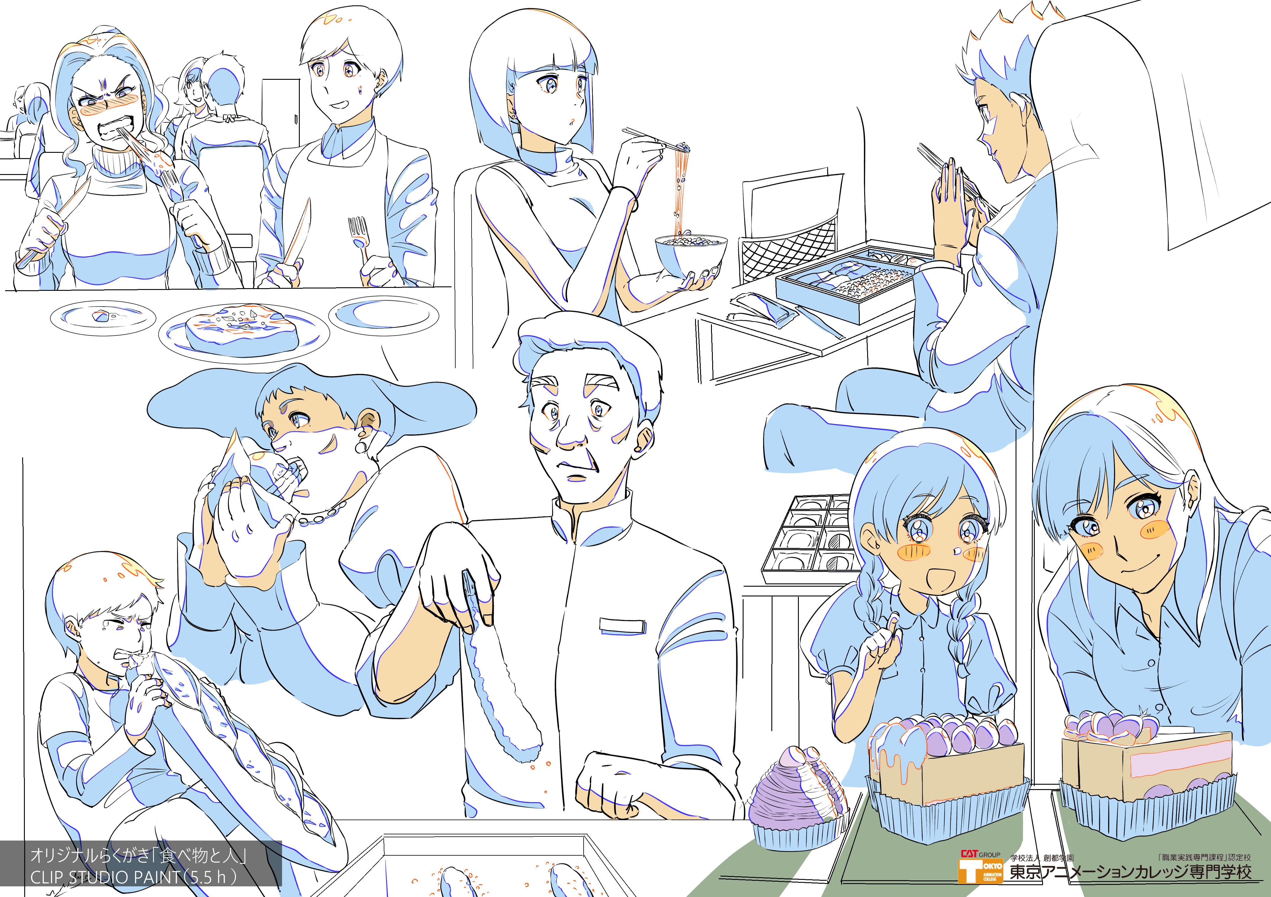 老若男女、アクションや日常など幅広く描いたものを入れたり、人間以外も描けるということをアピールできるように、動物や食べ物なども意識的に入れるようにしました。就職・デビューセンターの先生に、ページのボリュームが足りない要素を新しく足すようにアドバイスをいただくことができてとても助かりました。