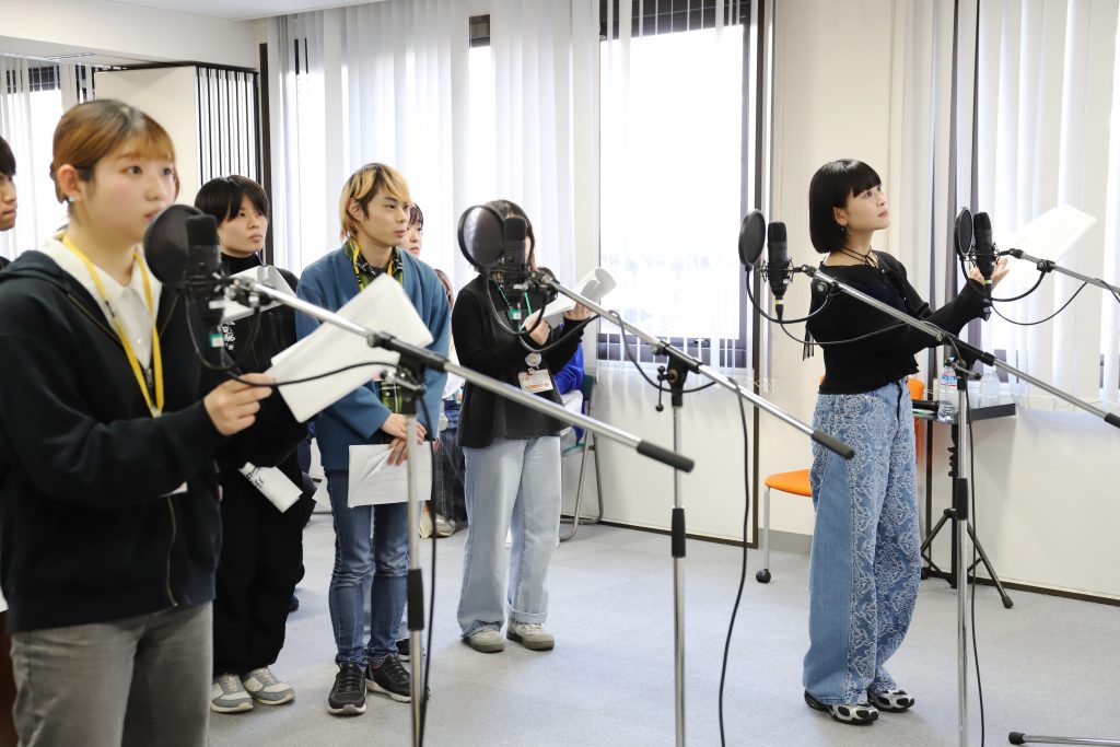 この日は、オープンキャンパス参加者全員にメッセージをいただいた後、声優コースの体験授業に本泉さんもご参加いただき、トークショー&一緒にアフレコ体験を行いました!