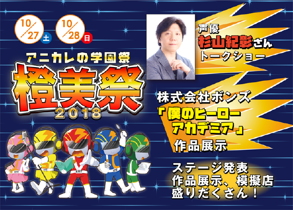 先生のひとり言 橙美祭開催! 2018年10月27日 本日は本校学園祭 橙美祭 初日でした! 雨は夜中の内に過ぎ、初日は天候に恵まれました! 橙美祭といえば今まで必ず雨にたたられていたのですが 今回は何と両日とも晴れそうです! そしてグループ校の大阪アニメーションカレッジ専門学校からも 先生が見学に来ました! 各種模擬店やイベントなど目白押しの橙美祭は 明日10月28日(日)も開催です! 杉山紀彰さんも声優ゲストで来校します。 是非皆さんお越しください!!